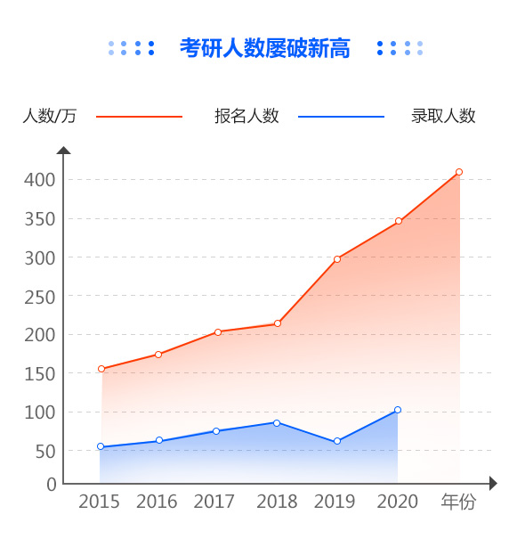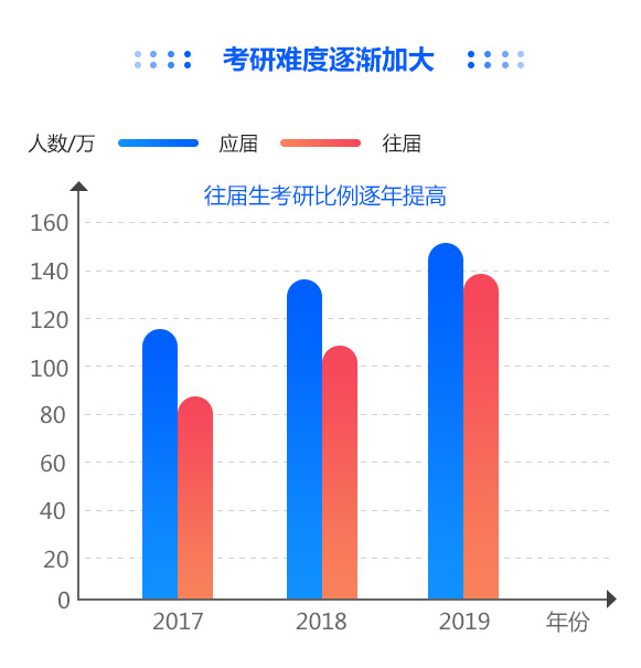 统计数据显示近五年报名人数趋势,其中往届生占比48.23%。2021年报名人数377万,2022预计400万,二战三战考生,同等学力考生,在职考研等群体加入,让考研变的更加优胜劣汰,全年长线备战必不可少